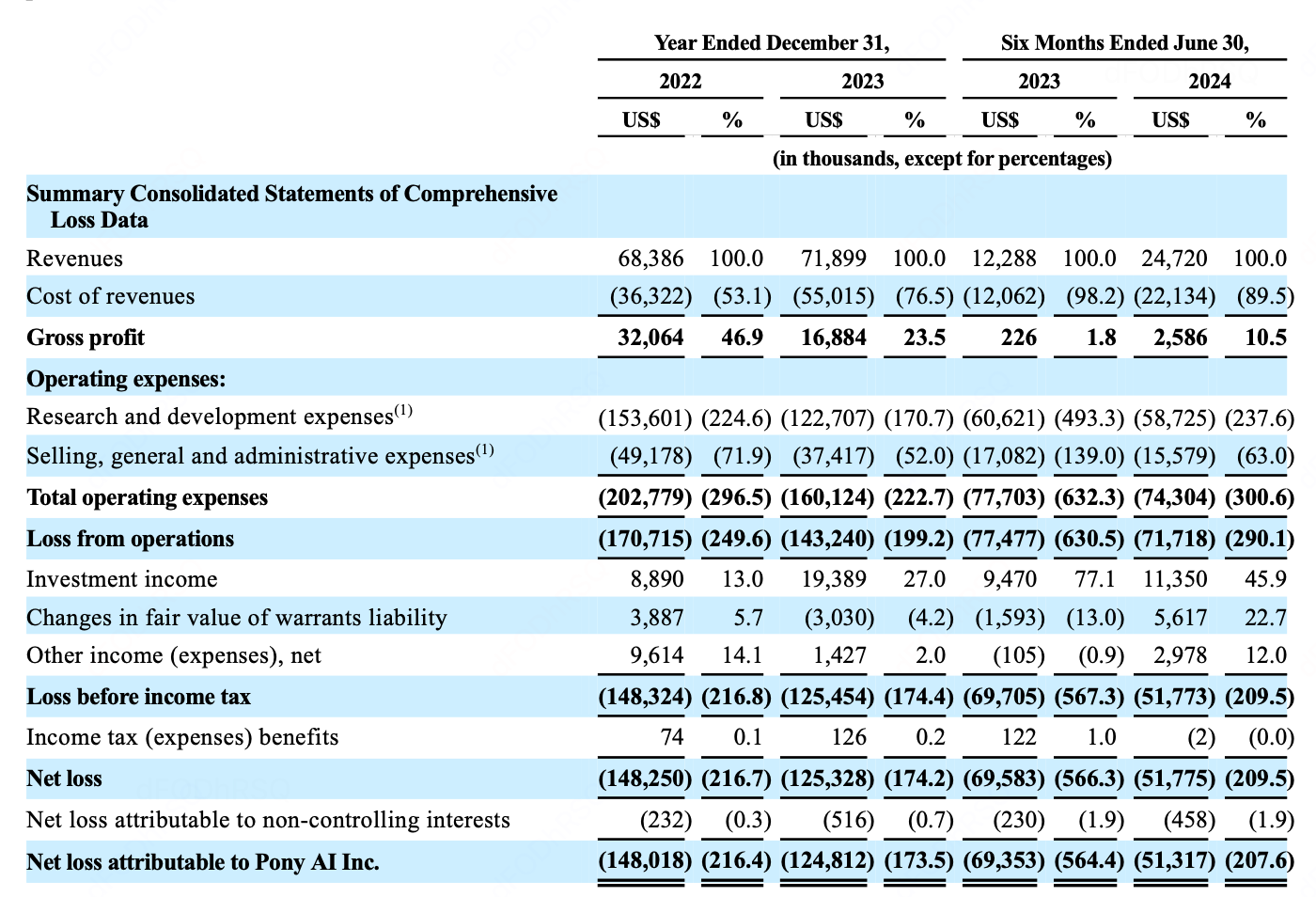 According to the S1 filing, Pony.ai reported revenues of $68.39 million in 2022, $71.90 million in 2023, and $24.72 million for the first half of 2024. These figures reflect the company's progress on its commercialization journey and demonstrate the autonomous driving industry's transition from technological research and development to practical commercial applications.